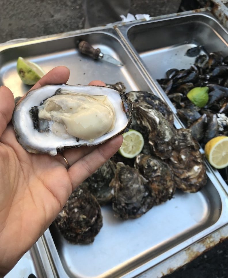 You can also sample fresh oysters directly at some of the stalls, where the fishmongers will open them for you and add a bit of lemon if you like.